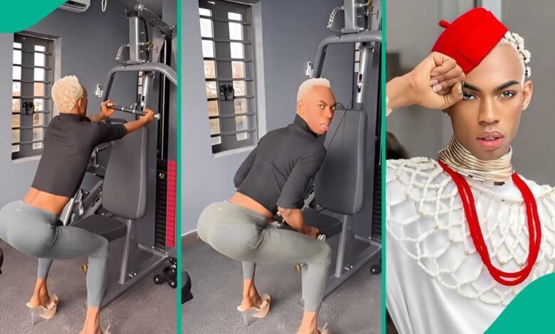 “Qual Kine PPL é?” James Brown encontrado na academia, o salto vira a cabeça de seu vestido incomum