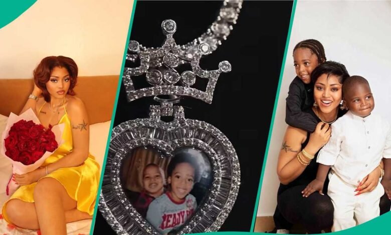 Regina Daniels ganhou um colar de diamantes personalizado com a foto dos filhos, o vídeo derrete o coração