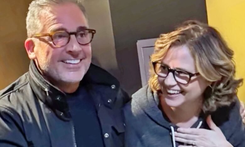 Em um vídeo no início do carrossel do Instagram, Carell surpreende os fãs nos bastidores, gerando aplausos e gritos de “Quão boa ela é nessa peça?” antes de abraçar seu ex-colega de elenco. Outra foto mostra a dupla posando com uma foto de fã de Carell como Michael Scott. EscritórioEm um episódio, ela comparece à mostra de arte de Pam.
