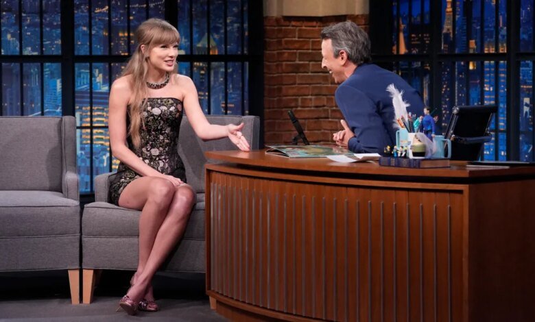 Taylor fala com Travis Kels em ‘Late Night with Seth Meyers’