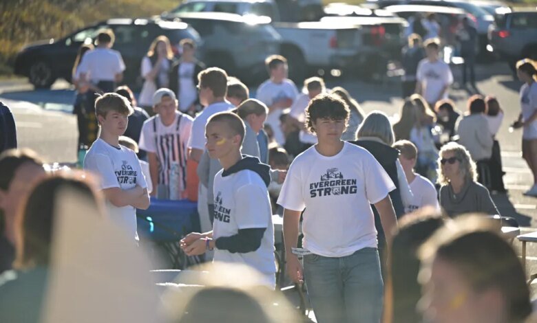 Quando o sol desaparece na sexta-feira, os membros da comunidade incluíram camisetas Evergreen Strong em suas jaquetas. A multidão desceu para o campo de futebol. E na primeira viagem do confronto de sexta-feira à noite entre Evergreen e Skyview, uma multidão de centenas de pessoas bateu os pés no metal das arquibancadas – um anfiteatro de US$ 325 mil que eles construíram com um pé.