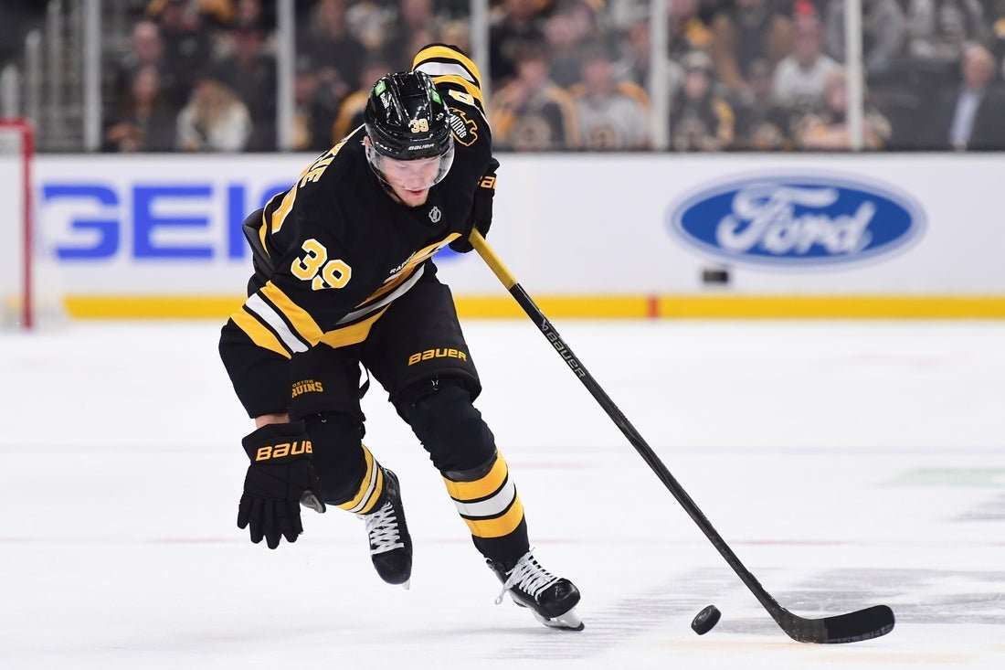 30 de outubro de 2025; Boston, Massachusetts, Estados Unidos; O central do Boston Bruins, Morgan Geeky (39), controla o disco no primeiro período contra o Buffalo. Sabres no TD Garden Crédito obrigatório: Bob DeChiara-Imagn Photos Com um novo treinador e um novo sistema, o Boston Bruins teve sua cota de altos e baixos durante as primeiras semanas da temporada.