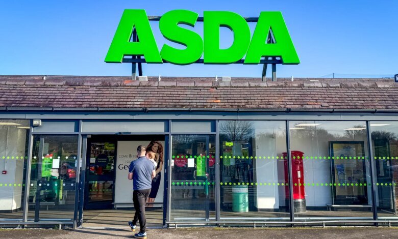 O logotipo da Asda aparece acima da entrada de um supermercado Asda.