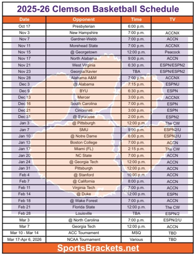 Cronograma de basquete Clemson 2025-26 para impressão; Formato PDF de transmissão de televisão