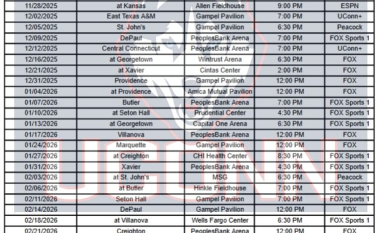 Cronograma de basquete UConn 2025-26 para impressão; Formato PDF de transmissão de televisão