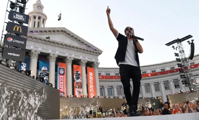 Ryan Tedder é responsável por OneRepullic durante o kickoff da NFL no Civic Center Park, 08 de setembro de 2016. A temporada normal da NFL 2016 começou na noite de quinta -feira no estádio, no Mile High Pitting Super Bowl Broncos e Carolinars.