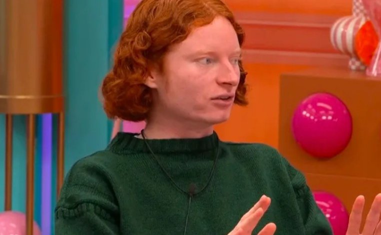 George, com cabelo ruivo cacheado e um suéter verde, levanta a mão durante o Big Brother.