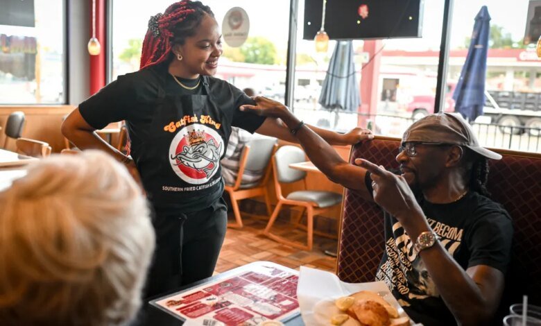 Os negócios estavam estáveis após a correria do almoço de um dia de semana recente. Angelo sai de trás da cozinha para falar com um cliente. com suas luvas pretas de cozinha ainda calçadas. A garçonete Deja trouxe bandejas com sanduíches de bagre frito, feijão vermelho, feijão cozido e torta de pêssego. “Uma casa não é um lar”, de Luther Vandross, lançou um feitiço caloroso pela sala.