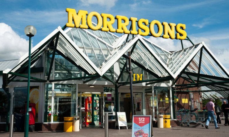 Vista exterior do supermercado Morrisons com grande placa amarela e entrada de vidro.