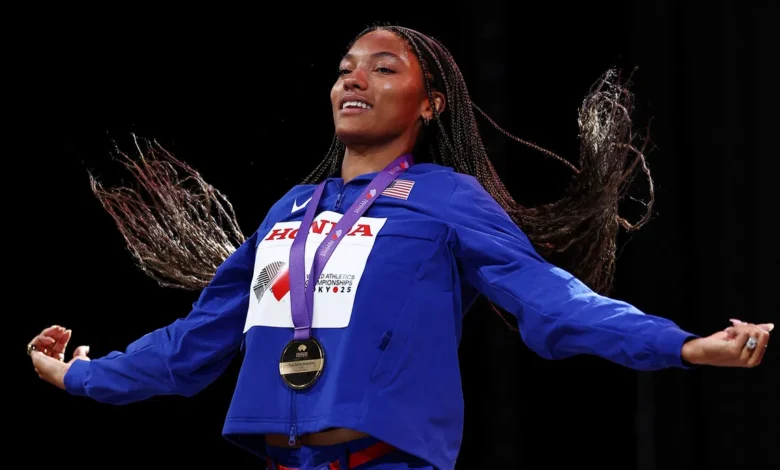 NOVA IORQUE – A campeã olímpica Tara Davis-Woodhall brilhando sob as luzes dos outdoors da Times Square enquanto liderava o evento de qualificação de salto em distância para o Athlos exclusivo para mulheres, em Nova York, na quinta-feira.