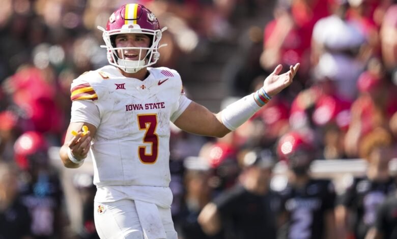 4 de outubro de 2025; Cincinnati, Ohio, Estados Unidos; O defensor do Iowa State Cyclones, Rocco Becht (3), reage aos companheiros durante o jogo contra o Cincinnati Bearcats, no segundo tempo, no Nippert Stadium. Crédito obrigatório: Aaron Doster-Imagn Photo.