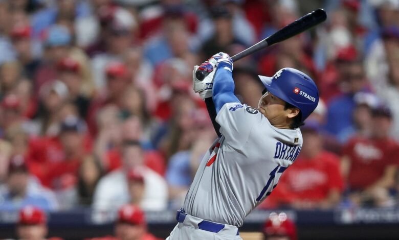 6 de outubro de 2025; Filadélfia, Pensilvânia, Estados Unidos; Los Angeles, DOTCs, estipula que os Shohei Ohtani (17) chegaram ao RBI e Filadels Eleles no sétimo jogo durante o segundo jogo dos NLDs para os playoffs de 2025 MLB no Citizens Bank Park. Crédito: Bill Streicher-Musicr-Music.