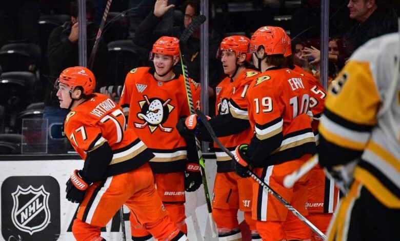 23 de janeiro de 2025; Anaheim, Califórnia, Estados Unidos; O Anaheim Ducksa comemora o gol marcado pelo lateral direito Frank Vatrano (77) contra o Pittsburgh Penguins no terceiro período no Honda Center. Crédito obrigatório: Gary A. Vasquez-Imagn Photo.