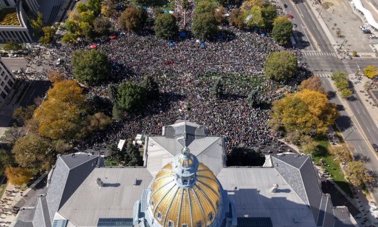 Onze pessoas foram presas no centro de Denver durante a manifestação secundária. depois que o principal protesto da tarde, “No Kings”, foi cancelado, disse a polícia.