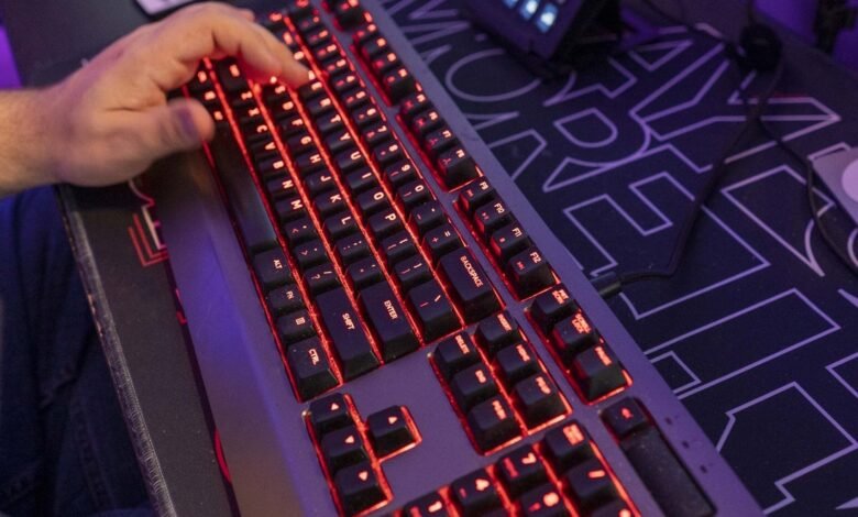 O teclado brilhante faz parte de dispositivos de streaming de videogames on -line que Jordan Woodruff usou na casa de Gilbert.