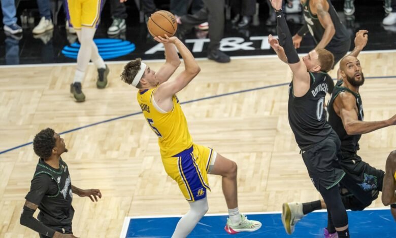 Veja Austin Reaves acertar o corredor da vitória na pista quando o tempo acabou, colocando o Lakers à frente dos Timberwolves.
