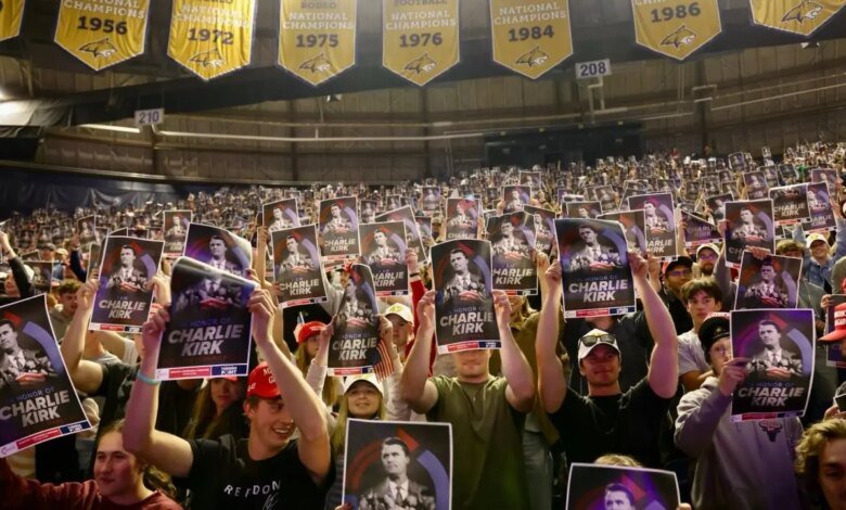 Uma multidão na Montana State University é vista segurando cartazes em homenagem a Charlie Kirk na terça-feira, 7 de outubro de 2025. (Greg Gianforte/X)