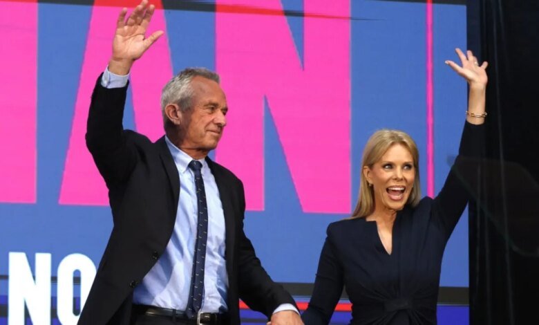 A atriz Cheryl Hines e seu marido Robert F. Kennedy Jr. cumprimentam apoiadores durante um evento de campanha em Oakland, Califórnia. (Justin Sullivan/Imagens Getty)
