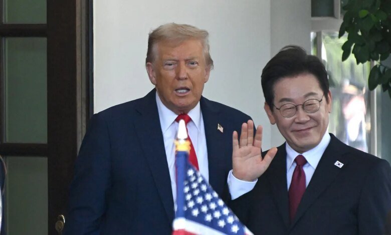 O presidente Donald Trump cumprimenta o presidente sul-coreano Lee Jae Myung ao chegar à Casa Branca em 25 de agosto de 2025 em Washington, D.C. (Chen Mengtong/China News Service/VCG via Getty Images)