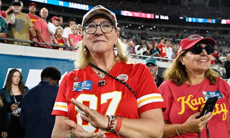 Donna Kelce, Jacksonville Jaguars e Kansas City Chiefs antes da partida em 6 de outubro de 2025 Jacksonville, Florida’daki, olhando antes da partida. (Mike Carlson/Getty Images)