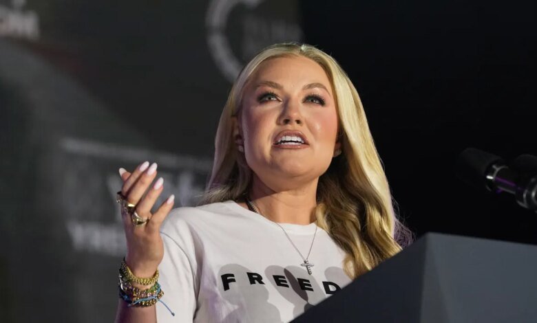 Erika Kirk fala no evento de turismo do campus “This Turning Point” na Universidade do Mississippi em Oxford, Mississippi, na quarta-feira. (Foto AP/Gerald Herbert)