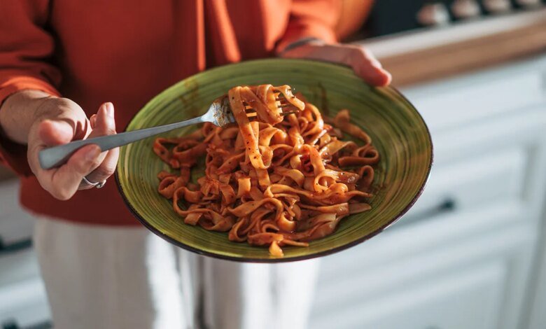 Mulher segurando um prato de macarrão com molho vermelho na cozinha.