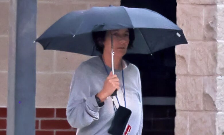 Ghislaine Maxwell segura o guarda-chuva sobre a cabeça o tempo suficiente para revelar seu rosto. Maxwell saiu para trabalhar na prisão antes do nascer do sol, ainda andando com um guarda-chuva cobrindo o rosto. Na hora do almoço, ele voltou para sua cela no dia 20 de setembro de 2025, com algumas pastas e uma mochila transparente com os fones de ouvido pendurados. (Matthew Symons/Mirrorpix/Mega)