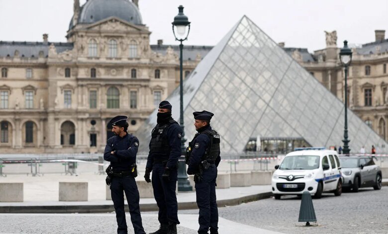 Policiais ficam perto da pirâmide do Museu do Louvre após denúncia de roubo em 19 de outubro de 2025 em Paris, França. (Reuters/Gonzalo Fuentes)