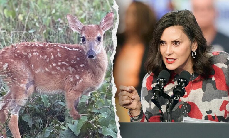 A governadora de Michigan, Gretchen Whitmer, está sob pressão para impedir que o DNR apreenda e sacrifique Peanut, um jovem cervo resgatado por uma organização sem fins lucrativos. (Geoff Robins/AFP via Getty Images)