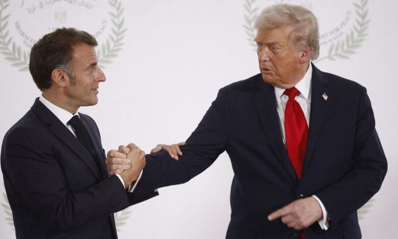 O presidente Donald Trump e o presidente francês Emmanuel Macron pareciam estar travando uma guerra privada de palavras durante um aperto de mão tenso e trêmulo no palco de uma cúpula no Egito na segunda-feira, promovendo o fim do conflito Israel-Hamas.