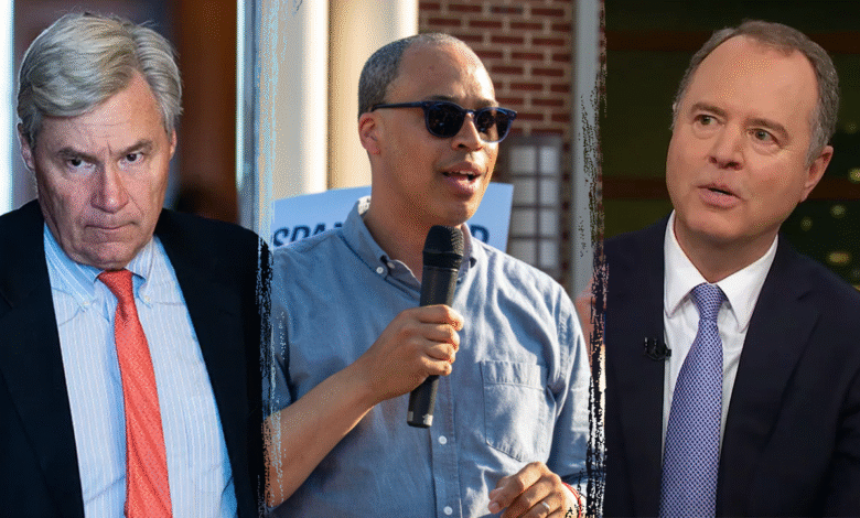 Os senadores Sheldon Whitehouse, D-I., e Adam Schiff, juntamente com outros democratas, recusaram-se a responder se Jones desistiria da disputa. (Bill Clark/CQ-Roll Call, Inc via Getty Images e Trevor Metcalfe/The Virginian-Pilot/Tribune News Service via Getty Images e Screenshot/HBO)