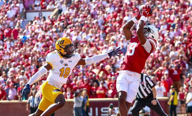 O wide receiver do Oklahoma Sooners, Keontez Lewis (9), entra em campo na frente do Kent State Golden Flashes e enfrenta Terrell Miller (18) se machuca no primeiro quarto no Gaylord Family-Oklahoma Memorial Stadium em 4 de outubro de 2025. (Kevin Jairaj/Imagn Imagens)