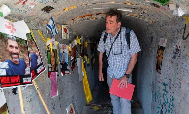 Um túnel temporário, como o túnel do Hamas, contém mensagens na parede e lembra aos visitantes que alguns prisioneiros israelenses torturados ainda suportam a rede subterrânea de Gaza.