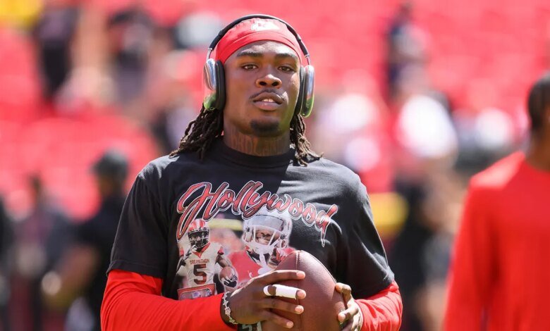 O wide receiver do Kansas City Chiefs, Rashee Rice, se aquece antes de um jogo de futebol americano da NFL contra o Cincinnati Bengals em 15 de setembro de 2024 em Kansas City, Missouri. (Foto AP / Reed Hoffmann, Arquivo)