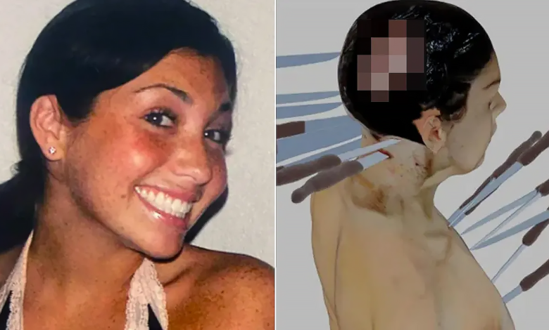 Uma foto dividida mostra Ellen Greenberg sorrindo em uma foto de família sem data, com facas geradas por computador com base no relatório da autópsia que mostra onde ela foi esfaqueada. (família Greenberg)