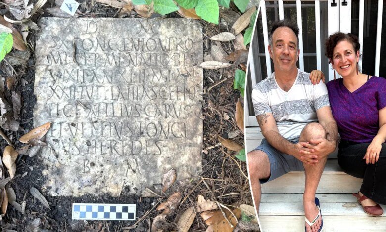 Daniella Santoro e Aaron Lorenz estavam limpando o mato de sua casa histórica em Carrollton, em março, quando encontraram uma placa de mármore gravada em latim.