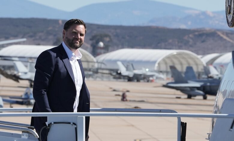 O vice-presidente J.D. Vance embarca no Força Aérea Dois na Estação Aérea Miramar do Corpo de Fuzileiros Navais em San Diego, Califórnia, em 19 de outubro de 2025. (Oliver Contreras-Pool/Getty Images)