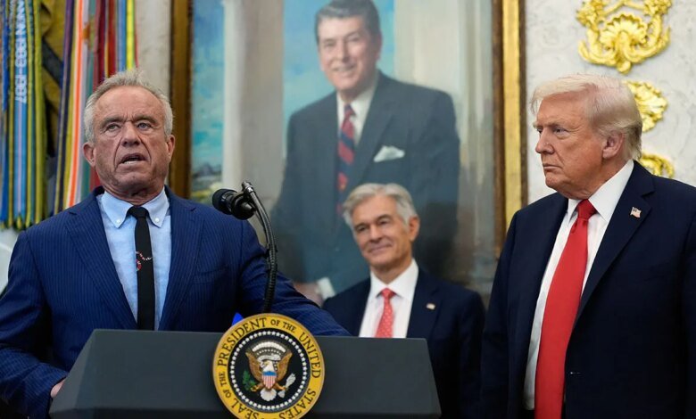 O presidente Donald Trump ouve o secretário de Saúde e Serviços Humanos, Robert F. Kennedy Jr., falar no Salão Oval da Casa Branca em Washington na quinta-feira, onde Trump elogiou os esforços para tornar os tratamentos de fertilização in vitro mais acessíveis. (Alex Brandon/AP)