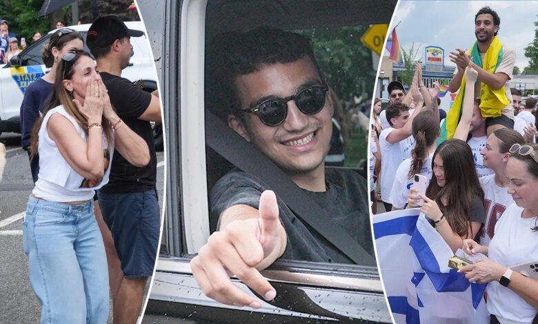 Pessoas agitando bandeiras israelenses e americanas se reúnem nas ruas para homenagear o americano Edan Alexander, que foi feito refém durante o ataque do Hamas a Israel em 7 de outubro de 2023. Edan Alexander retornará à sua cidade natal, Tenafly, Nova Jersey, em 19 de junho, após ser libertado com um acordo feito em 12 de maio. (Foto: Lokman Vural Elibol/Anadolu, via Getty Images)