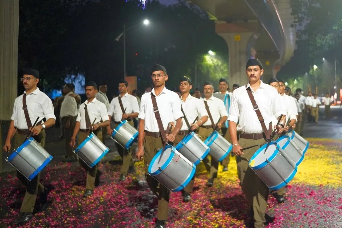 Foto: Voluntários do RSS comemoram seu centenário com uma marcha de raiz. Foto: @RSSorg/X