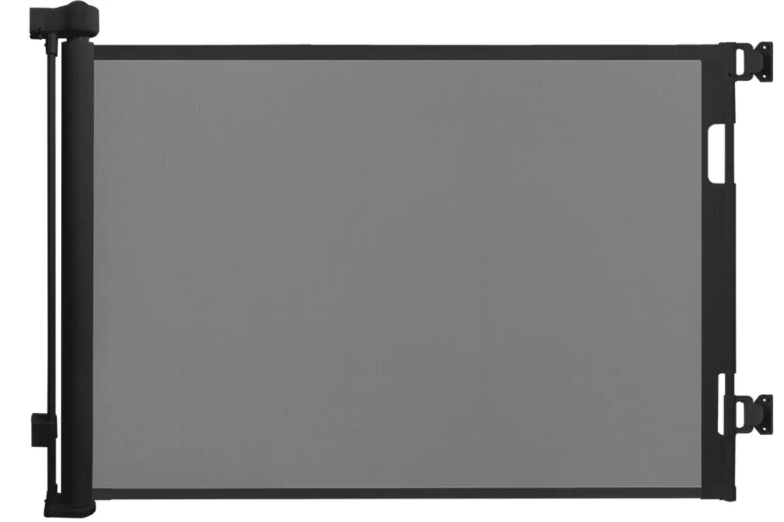 As portas retráteis vêm em preto e cinza e apresentam uma tela de malha retrátil entre a estrutura metálica. As portas têm aproximadamente 33 polegadas de altura e 118 polegadas de largura.