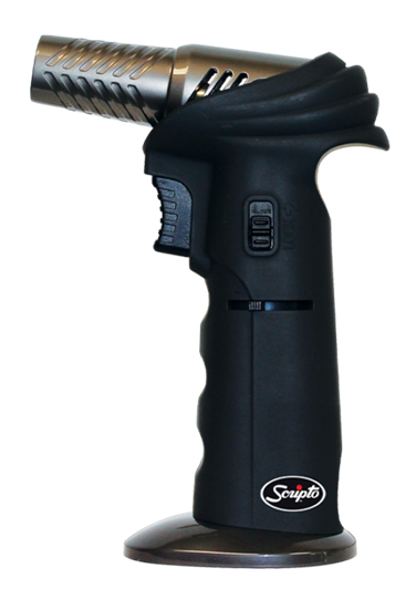 A tocha Scripto Premium possui uma cabeça de metal ajustável em quatro posições, punho de borracha preta antiderrapante e base de metal de veludo preto.