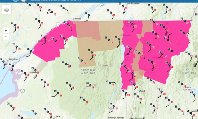 Os meteorologistas do Serviço Meteorológico Nacional em Burlington disseram em sua previsão oficial no domingo: “A combinação de baixa umidade e rajadas de vento hoje pode causar condições quase de bandeira vermelha em partes de Vermont e norte de Nova York hoje. Os ventos também devem continuar a aumentar ao longo das encostas ocidentais das Montanhas Verdes e nas encostas norte das Adirondacks até o início de segunda-feira, o que pode resultar em cortes de energia isolados.