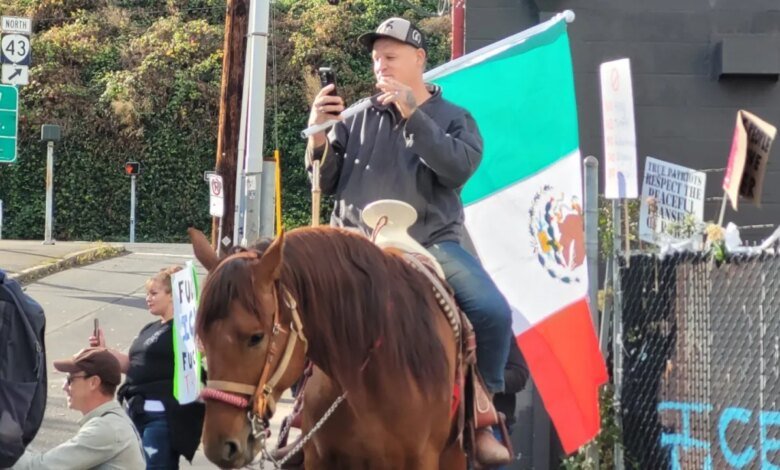 “Meus pais são imigrantes, o pai é mexicano e a mãe é russa”, disse Garcia. “Venho aqui para apoiar meu povo e fazer algo diferente que eles nunca viram. É pacífico. Você sabe, venho aqui a cavalo e mostro às pessoas e mostro ao meu povo que os apoio 100%.”