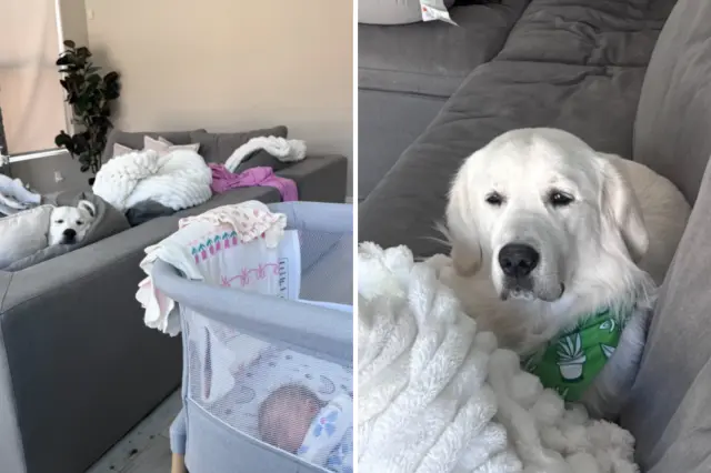 Corações derretem quando o Golden Retriever ajuda a mãe com o bebê e depois luta contra a exaustão