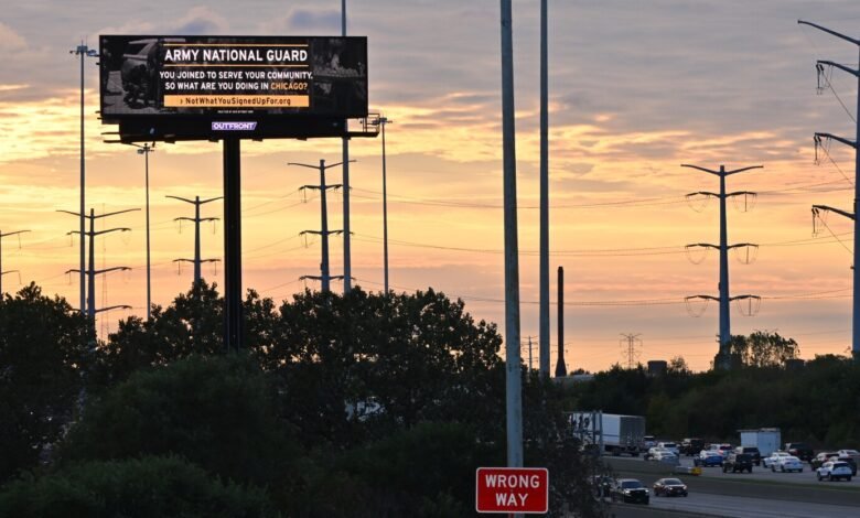 Um grupo progressista anti-guerra pagou por 11 outdoors na área de Chicago questionando o envio de tropas da Guarda Nacional e fornecendo um link para recursos legais para os militares que desejam desistir.