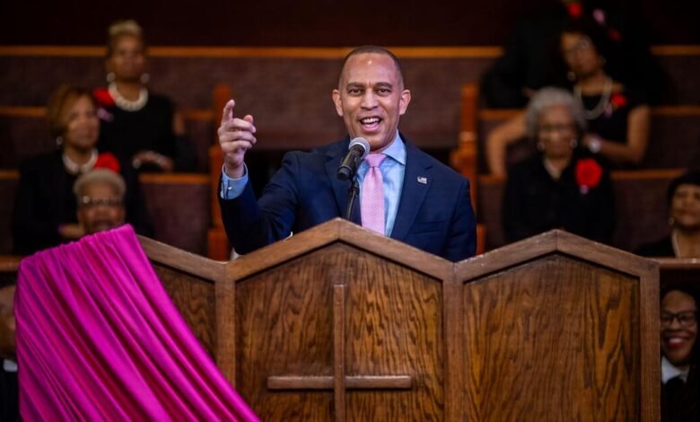 O líder da minoria na Câmara dos EUA, Hakeem Jeffries (DN.Y.), visitou três igrejas negras em Los Angeles na manhã de domingo para promover o esforço de redistritamento da Califórnia, que poderia adicionar cinco ou seis delegados democratas às suas fileiras.