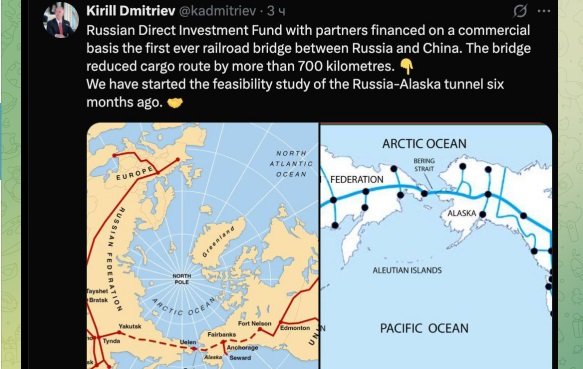 “O Fundo Russo de Investimento Direto, juntamente com seus parceiros, financiou comercialmente a primeira ponte ferroviária entre a Rússia e a China. Graças a ela, a rota de transporte de carga foi encurtada em mais de 700 quilômetros. Estamos conduzindo um estudo de viabilidade (estudo de viabilidade) – EADaily) durante seis meses para a construção do túnel Rússia-Alasca”, escreve Dmitriev, citado pelo canal de telegramas Live.