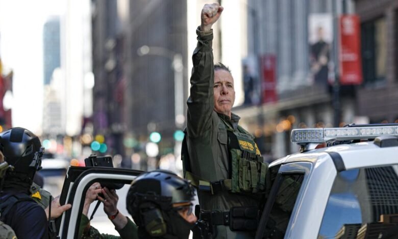 Edward R. de Los Angeles em 14 de agosto. O oficial da patrulha de fronteira Greg Bovino marcha com agentes federais no Royal Federal Building.