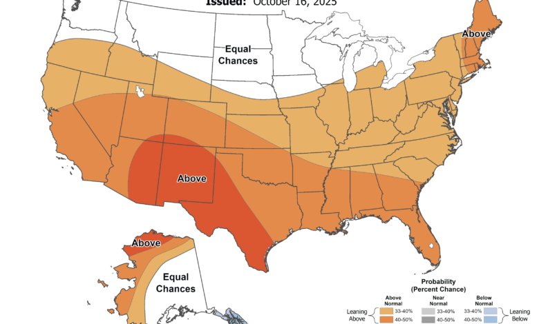 O Centro de Previsão Climática, que faz parte da Administração Nacional Oceânica e Atmosférica (NOAA), Perspectiva sazonal revelada Quintas-feiras de novembro de 2025 a janeiro de 2026.